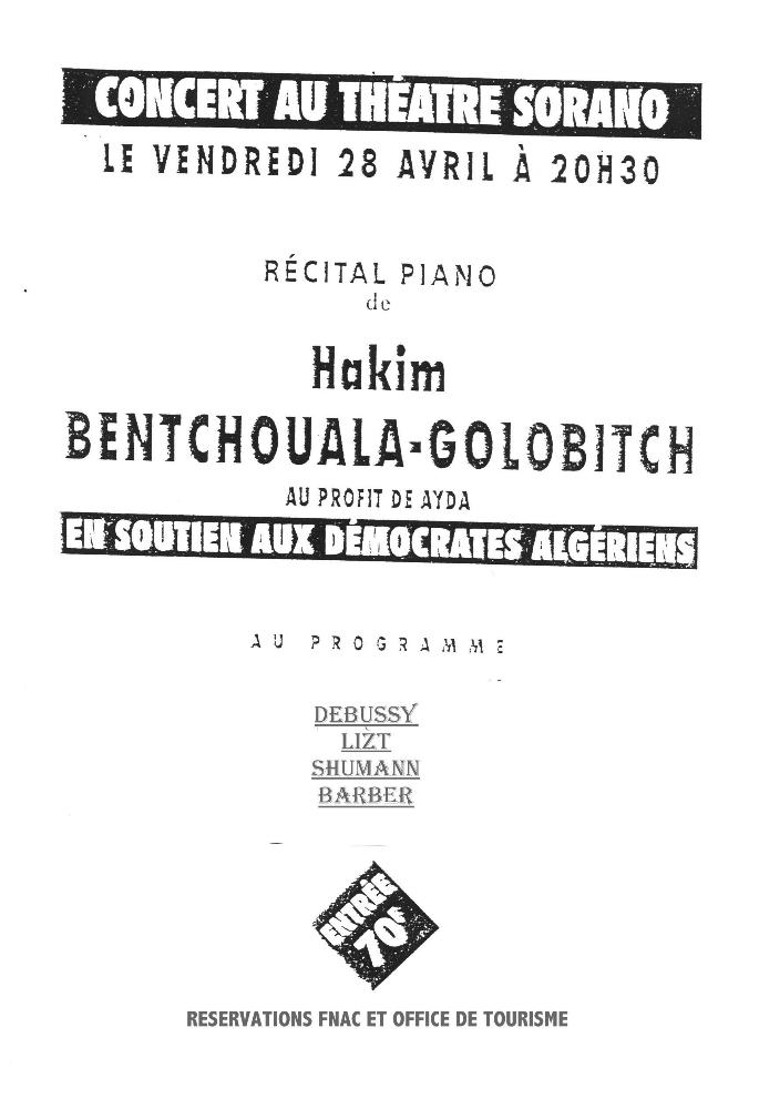Tract invitant au récital de piano d'Hakim Bentchouala-Golobitch le 28 avril 1995. (recto)