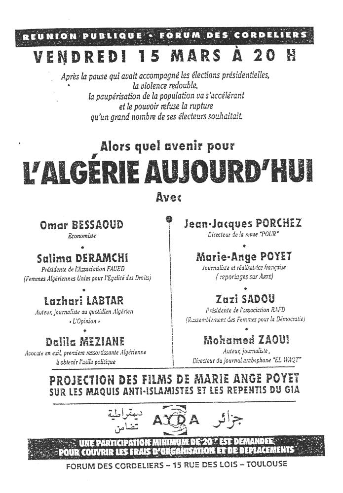Tract invitant à une rencontre débat sur la situation sociale et économique en Algérie le 13 février 1997.