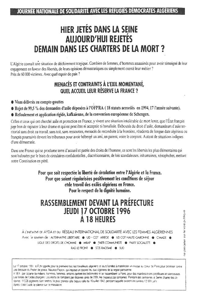 Tract appelant à la manifestation du 17 octobre 1996.
