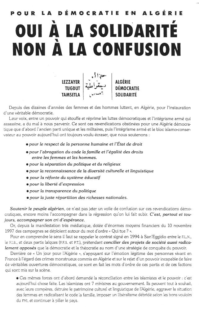 Appel d'Ayda pour la démocratie en Algérie intitulé "Oui à la solidarité, non à la confusion 1997". (recto)