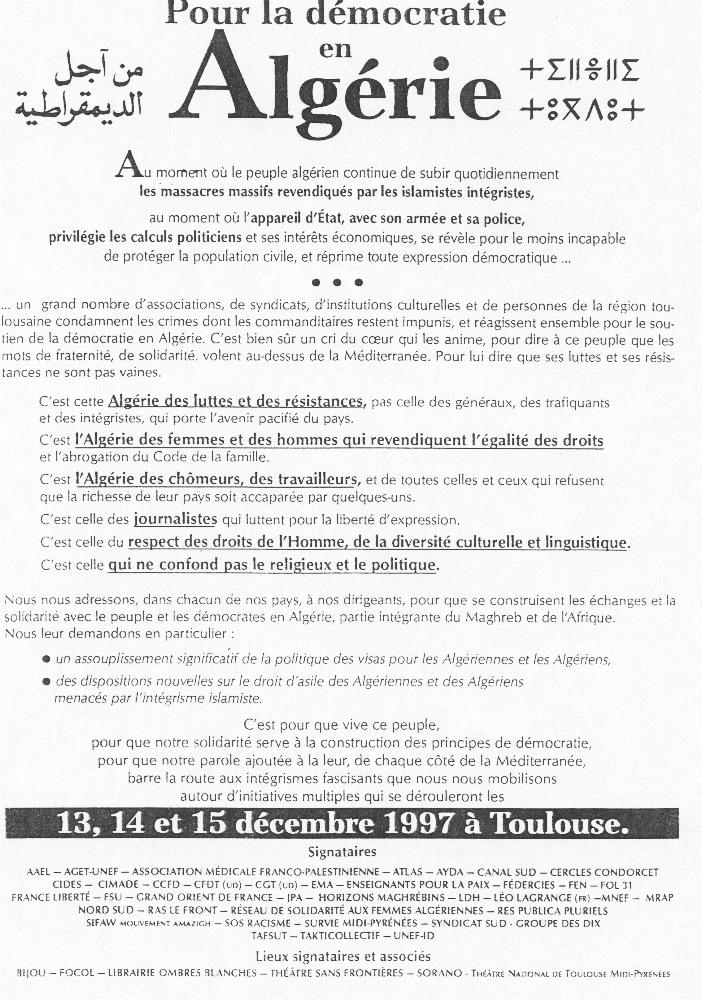 Tract invitant à participer aux journées des 13/14/15 décembre 1997 "pour la démocratie en Algérie".