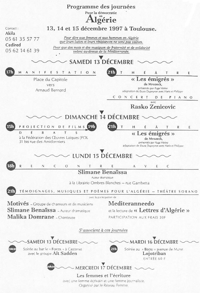 Programme des journées des 13/14/15 décembre 1997 "pour la démocratie en Algérie".