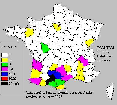 En étudiant le fichier des abonnés, on constate une implantation géographique étendue avec 137 abonné(e)s réparti(e)s sur 27 départements. Comparé à la diffusion d'Ayda elle s'étend sur beaucoup plus de départements notamment au sein de la région PACA. Cela s'explique par les relations établies par Ayda au sein de la Coordination Grand Sud qui a permis une diffusion importante de la revue. Présente dans tout le sud de la France, Asma a connu un rayonnement important, du à la pertinence de son contenu et aux attentes qu'elle a satisfaites. De nombreuses associations59 comme SAFA, mais aussi Grenoble ont souscrit des abonnements et ont commandé des numéros en grand nombre afin d'assurer la diffusion, la circulation et une tribune élargie aux démocrates algériens. En se penchant sur les bilans financiers d'Ayda60 , Asma a connu quelques difficultés d'autofinancement au tout début. En effet, les frais engagés pour la réalisation de la revue ont occasionné des dépenses assez importantes sur le budget de l'association. A titre d'exemple, les trois premiers mois de l'existence d'Asma se sont traduits par des dépenses de l'ordre de 6224,64 francs alors que le total des abonnements pour l'année 1995 (6 mois) ont permit de recueillir la somme de 6395 francs61. Cependant la diffusion de la revue tirée à 1500 exemplaires62 se faisait aussi beaucoup, lors des stands tenus par Ayda, au cours des manifestations, mais également lors des tractages, place Saint Sernin, à Toulouse, le dimanche matin. Lors des réunions de l'Assemblée des militants, toutes les semaines, un certain nombre de personnes étaient volontaires pour aller vendre des numéros d'Asma sur les marchés63 . Les équipes étaient composées de huit à dix personnes64. On retrouve d'autres lieux de vente et notamment l'Université de Toulouse -le- Mirail qui permettait de sensibiliser le milieu étudiant aux difficultés que connaissaient les démocrates en exil. Par exemple lors de la semaine du 5 au 9 février 1995 une table a été tenue pour assurer la vente d'Asma de 12 heures à 14 heures et a permis pour la seule journée du lundi 5 février, d'écouler une cinquantaine de numéros. D'autres possibilités ont été exploitées, avec la vente par le bouche à oreilles, lors de manifestations sur la voie publique ou encore le dépôt de numéros au cinéma Utopia, au CIDES (1 rue Joutx-Aigues à Toulouse) ou encore à la librairie Ombres Blanches (rue Gambetta à Toulouse).
